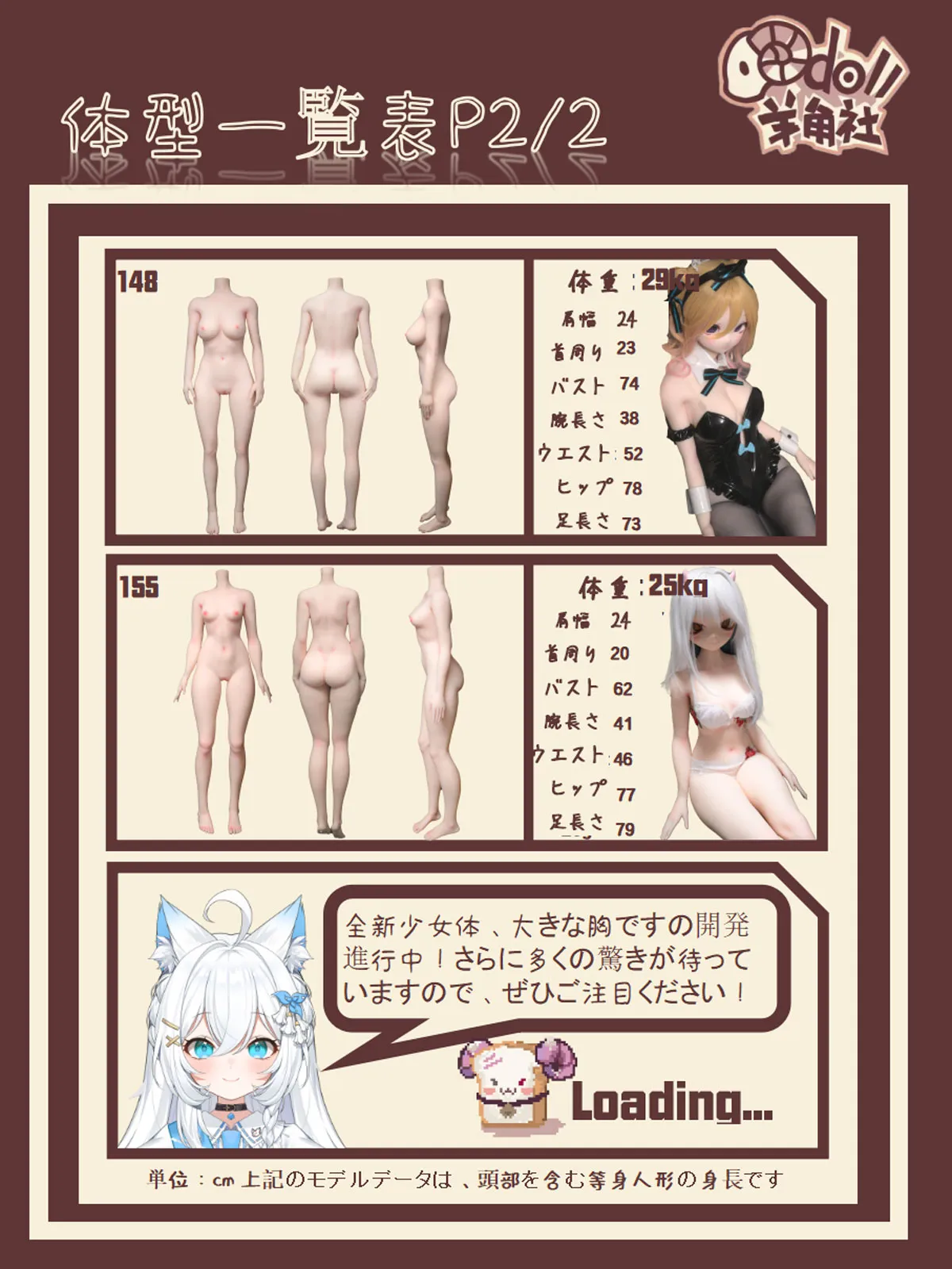ドールの身長は155cm、スリーサイズは「B:86cm(Eカップ)、W:61cm、H:100cm」。